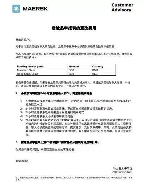 出口至美國(guó)或加拿大的危險(xiǎn)品,危險(xiǎn)品申報(bào)單中必須提供準(zhǔn)確的危險(xiǎn)品申報(bào)信息。從2019年11月8日開(kāi)始,如在大船預(yù)計(jì)開(kāi)船日之后修改危險(xiǎn)品申報(bào)單(MDGF)上的任何信息,馬士基將收取更改費(fèi)。